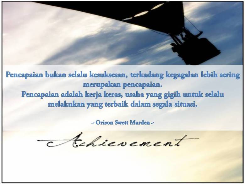 ACHIEVEMENT” atau pencapaian. Topik ini sangat menarik buat saya, karena banyak sekali di antara teman-teman saya yang suka mengeluh kepada saya, bahwa mereka merasa selama hidupnya tidak pernah berhasil mencapai sesuatu yang berarti dalam hidup mereka. Bahkan saya sendiri dulu juga selalu menganggap saya tidak pernah mencapai sesuatu.