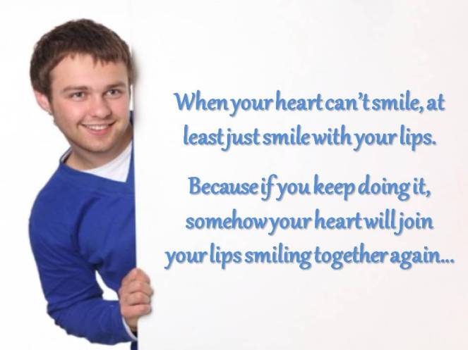 Nevertheless, keep smiling because that simple smile can send a great message to our brain. A smile on our face will tell our brain that we are feeling happy and content, and the message will be forwarded “silently” by the brain to our emotion and slowly but sure our feeling will get better.